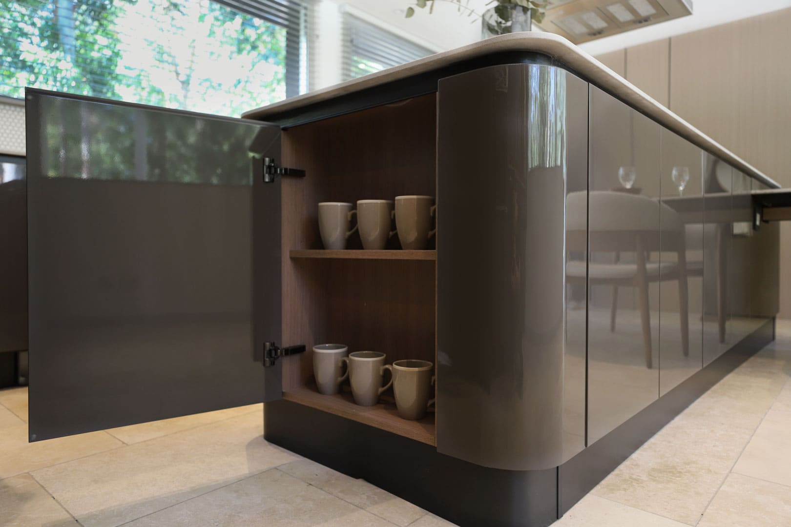 La Ballena presenta una fuerte identidad formal basada en curvas: la baranda, los espejos, la geometría interior y exterior. Las punteras curvas de Johnson permitieron continuar ese lenguaje dentro de la cocina y reforzar su coherencia estética.